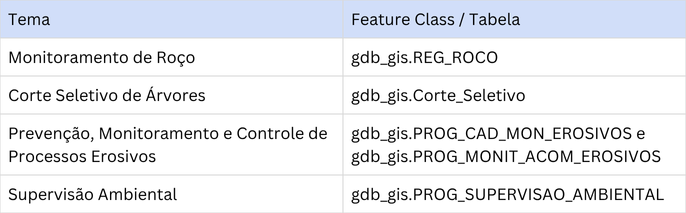 Como exemplo, a aplicação de Gestão de Faixa de Servidão contemplou os seguintes temas: