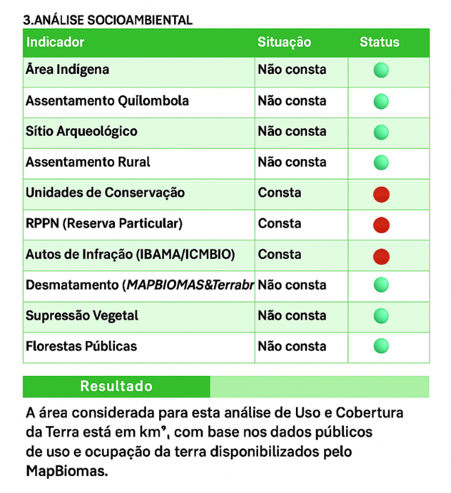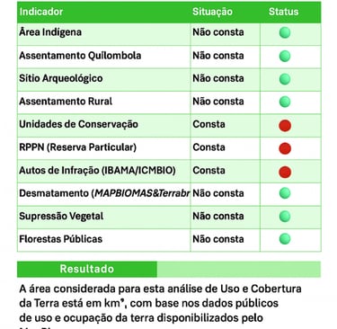 ➡️Geração automatizada de relatórios ambientais: consolidação de diagnósticos ambientais, situação fundiária, presença em áreas protegidas e alertas de desmatamento, oferecendo uma visão integrada e atualizada do cenário territorial.